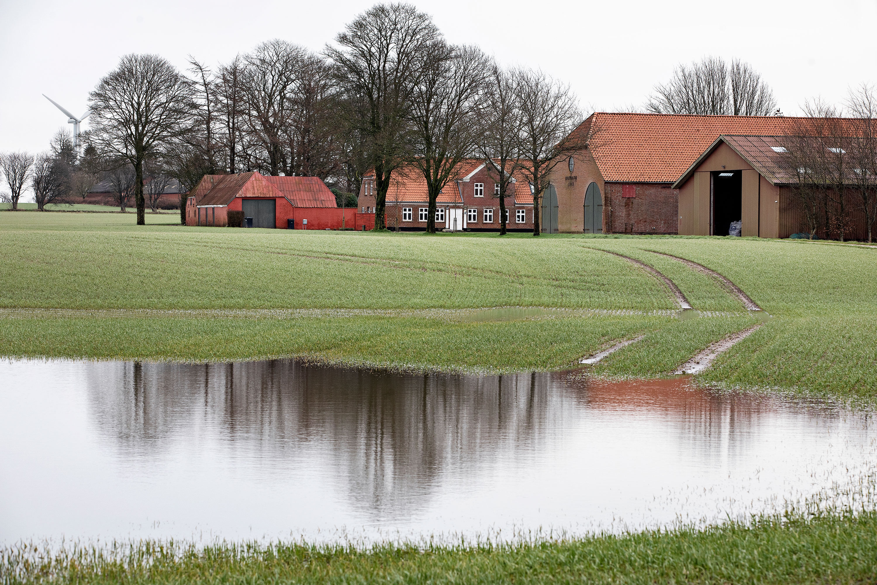 Den seneste tids store regnmængder har ødelagt 40 hektar af Jens Gudike Flys marker. På markerne var der nemlig sået vinterhvede, som han skulle have brugt til fodring af sine svin. Men nu skal han have sået jorden om med vårbyg på grund af den store mængde byger, det meste af februar bestod af.