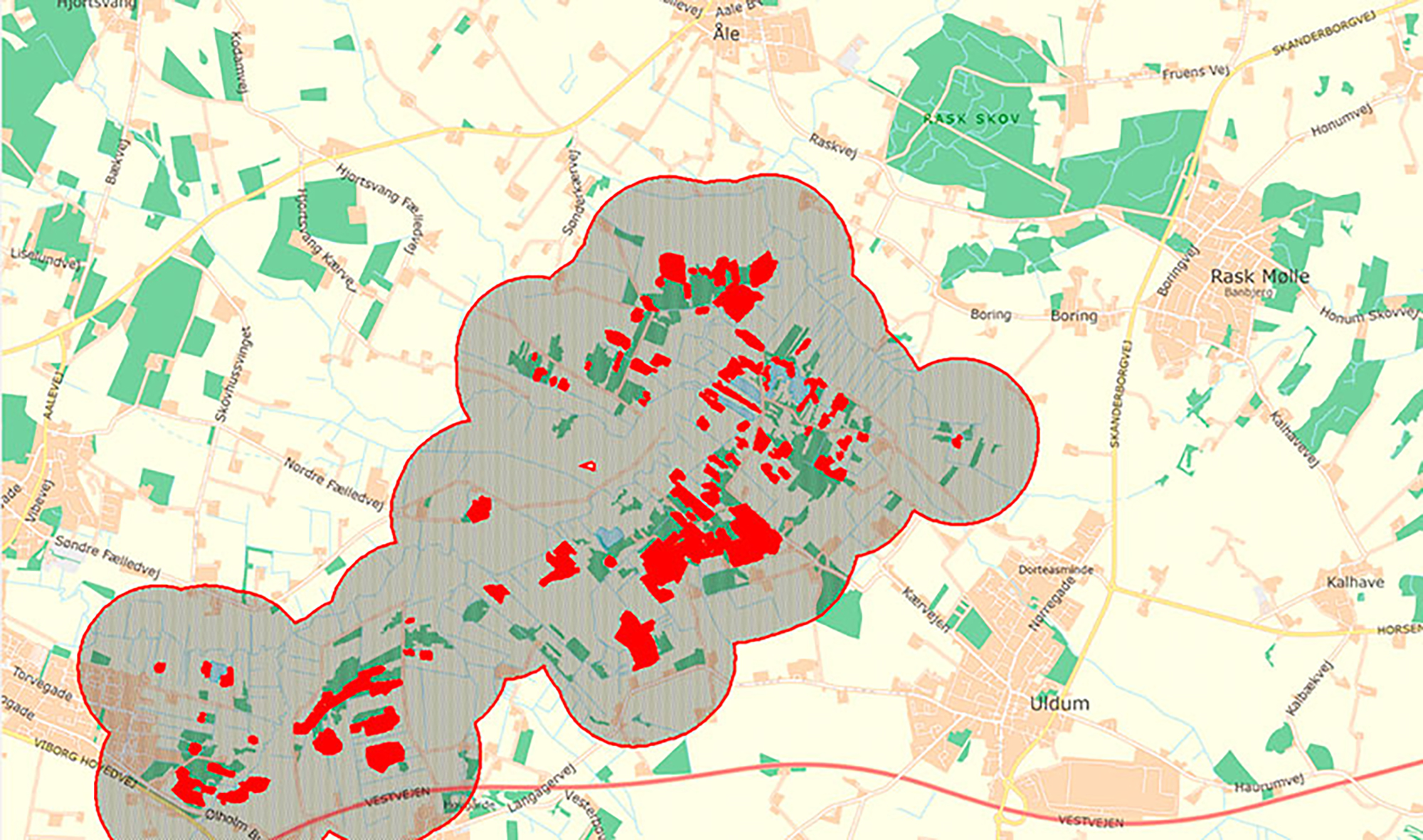 SEGES har derfor fremstillet et landsdækkende GIS kort, der gør det muligt at foretage en indledende screening af egnede placeringer for store husdyrbrug.