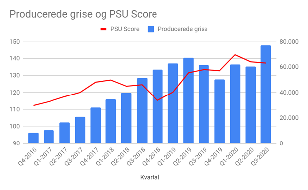 Tal fra deltagerne i Produktionskoncept Slagtesvin. PSU Scoren for senest opgjorte kvartal (Q2, 2020) er 137 svarende til 37 kr. mere pr. gris.