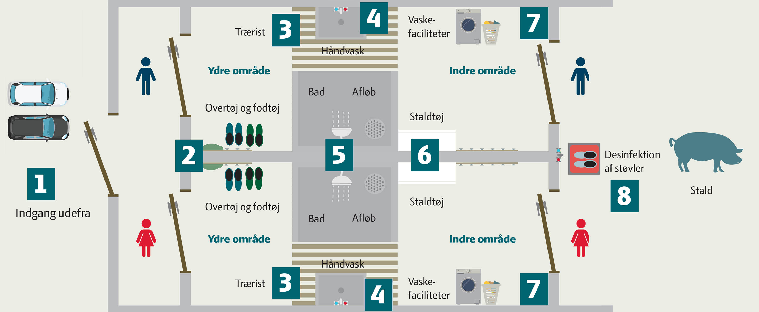 I ren zone omklædes der til rent staldtøj og fodtøj. Beskidt staldtøj skal forblive i besætningsområdet og bør adskilles fra rent arbejdstøj. Det beskidte arbejdstøj bør vaskes hyppigt.