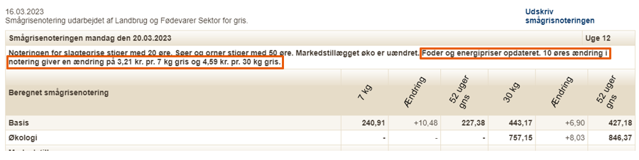 Den beregnede Smågrisenotering beror på Danish Crowns slagtegrisenotering.Beløbet vil løbende ændre sig, når der ændres i forudsætningerne, f.eks. foder- og energiomkostninger, som opdateres månedligt.
