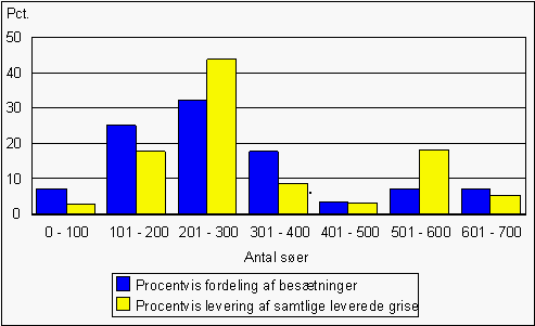 I figur 2 er vist en oversigt over fordeling af leverandører efter besætningsstørrelse og andel af de leverede grise. Som det fremgår af figuren blev over halvdelen af grisene leveret af besætninger med 100-300 søer. De 28 besætninger med i alt 8.628 søer leverede eller forventede at levere 84.600 grise/år (beregnet).