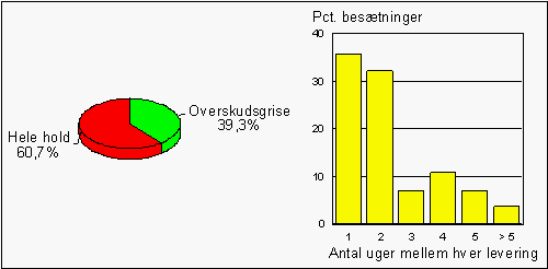 Som det ses af figur 3, leverede hovedparten (ca. 70 pct.) af besætningerne grise hver - eller hver anden uge. Ca. 60 pct. af besætningerne leverede grisene som hele hold, mens resten leverede overskudsgrise (dvs. grise, der ville medføre pladsproblemer i besætningens egne smågrisestalde, såfremt de ikke blev fjernet). Der var længere mellem leveringer i besætninger, der afsatte hele hold sammenlignet med besætninger, som solgte overskudsgrise. Besætninger, som leverede hele hold, lod typisk en smågrisesektion stå tom i leveringsugen.