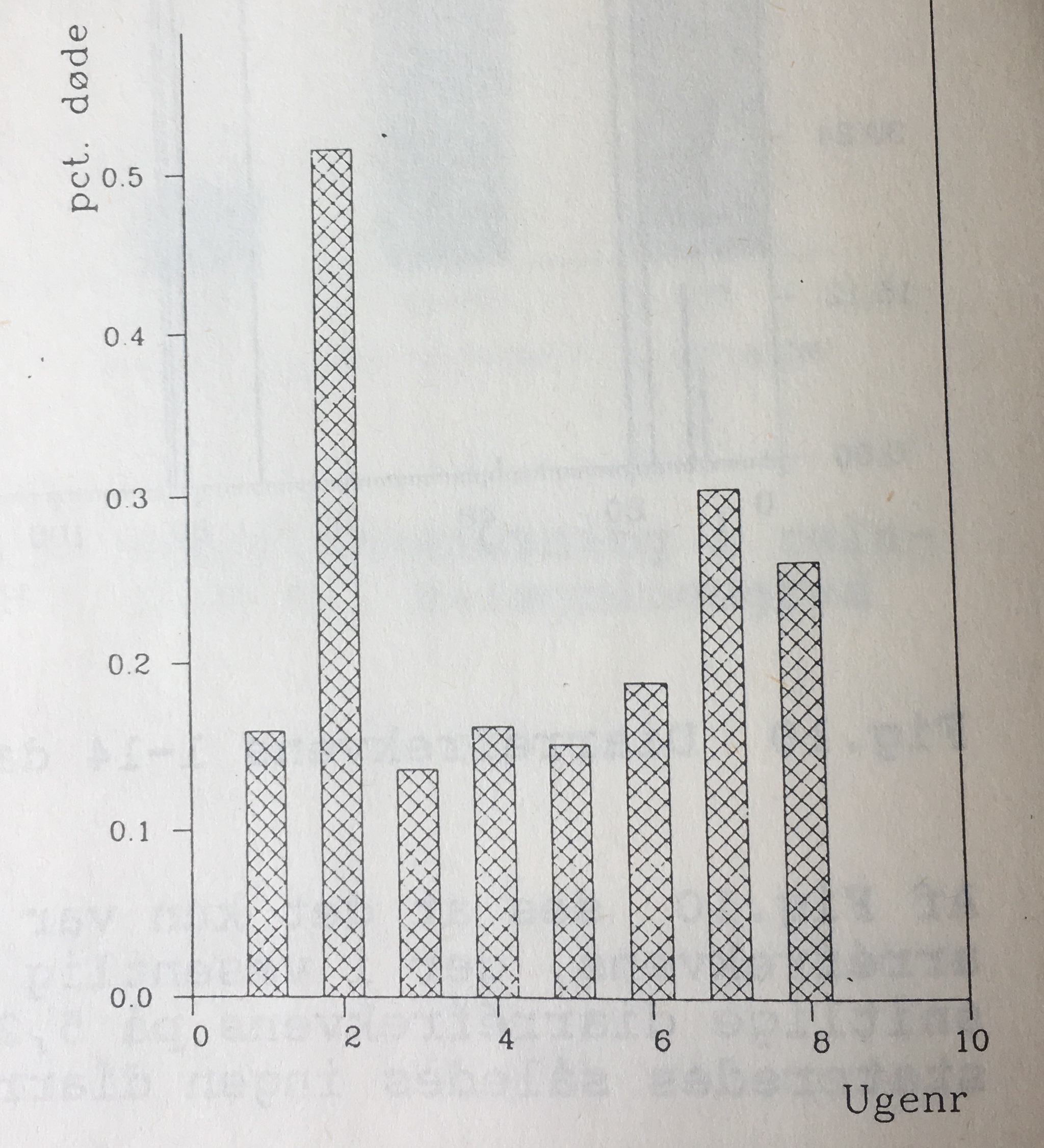 Fig.4 viser at dødeligheden varierede en del fra hold til hold. (Figur 4 er ikke medtaget i denne tekst, men kan rekvireres ved henvendelse til Landsudvalget for Svin, DANSKE SLAGTERIER, Axeltorv 3, 9 København V., tlf. 33 11 60 50, (Red.)). I sidste 1/3-del af forsøgsperioden var der en tendens til faldende dødelighed. I 11 af holdene var der ingen døde. Dødsfaldene er overvejende sket i to perioder i Fællesstalden, dels i 2. uge og dels i 7. og 8. uge (Fig.5)