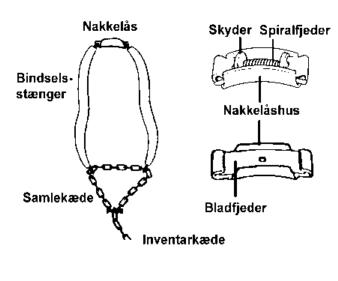 Nakkelåsen var Voervadsbros egen model i 3 størrelser, hvor nakkelåshus, spiralfjedre og skydere var udført i el-galvaniseret stål.
