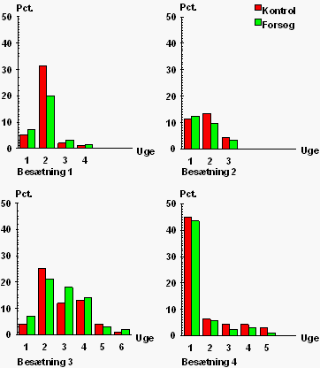 Antallet af diarréudbrud pr. kuld, antal grise pr. diarréudbrud og behandlingsperiodens længde varierede meget lidt mellem forsøgs-og kontrolgruppene indenfor besætningerne. Mellem besætningerne var der forskelle i procent behandlede grise. Denne forskel er naturlig, da det var landmandens sædvanlige behandlingsprocedure, som skulle følges, blot skulle proceduren være ens i begge grupper.