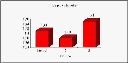 Med hensyn til ford. aminosyrer blev der i startfoderet brugt normen for 4 ugers grise i kontrolgruppen og gruppe 2, mens der blev brugt normen for 6 ugers grise i gruppe 3. Foderet til grisene i gruppe 3 havde således samme andel af råvarer som foderet i gruppe 2, på nær at der blev brugt færre syntetiske aminosyrer. Resultatet i perioden 4-6 uger viste, at grisene i gruppe 3 havde tendens til lavere daglig tilvækst end grisene i henholdsvis kontrolgruppen (P <,12) og gruppe 2 (P <,07). Dette resultat antyder, at smågrise i den første periode efter fravænning har behov for den norm for aminosyrer, som er beskrevet i Fokus på" Normer for næringsstoffer", 1991, Landsudvalget for Svin, DANSKE SLAGTERIER.