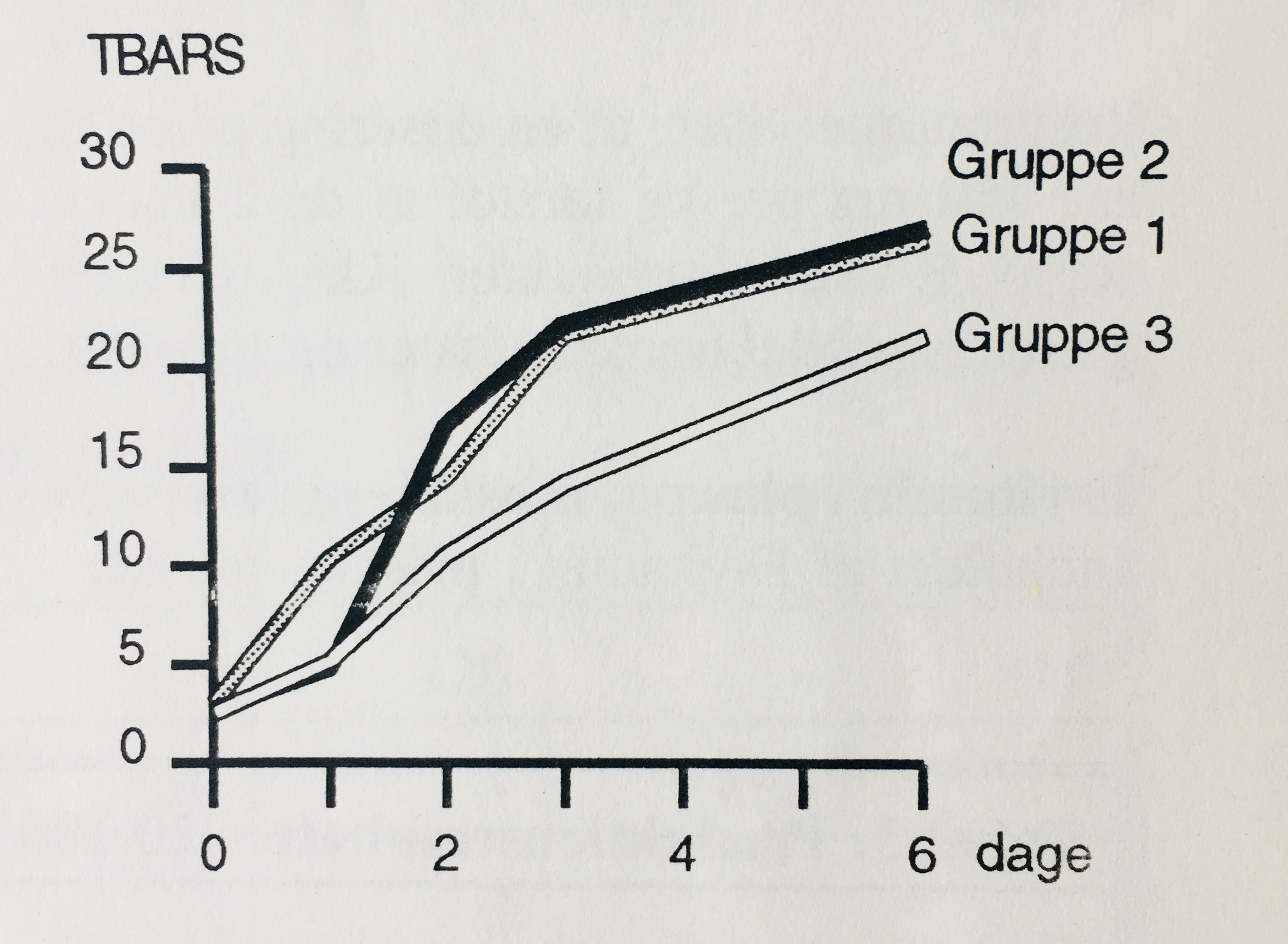 Normalt ses en langsom udvikling af harskhed i ferske hele kødstykker under kølelagring, men et øget E-vitaminindhold bevirkede en yderligere dæmpning i udviklingen. Effekten af mængden af E-vitamin blev yderligere testet under de dårligst tænkelige forhold for kødet. Udviklingen i TBARS i kølelagrede, varmebehandlede, hakkede kødprøver fra kammuskel er vist i figur 2, der er kun vist gennemsnitsværdier for de 3 E-vitaminmængder.