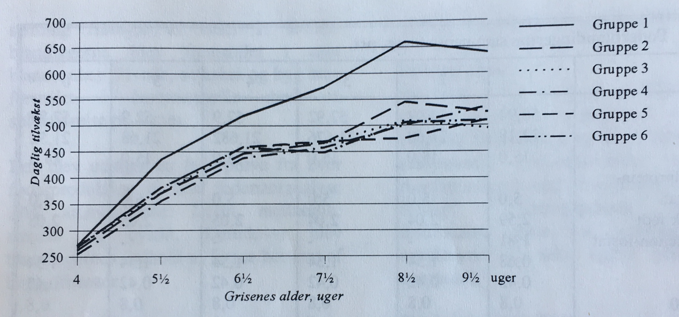 Vækstkurverne for de seks grupper fremgår af figur 1. Dette viser, at den reducerede fosfortildeling i grupperne 2-6 har en øjeblikkelig negativ effekt på grisenes daglige tilvækst. Foder, der kun indeholder de anvendte råvarers naturlige indhold af fosfor, er ikke tilstrækkeligt til at sikre maksimal produktion. Dette blev ligeledes fundet af Poulsen (1994) hos ung- og slagtesvin.