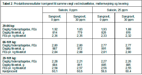 Der var ingen statistisk sikker effekt af Sangrovit eller Salocin på produktionsværdien, og der var ingen statistisk sikker vekselvirkning mellem Sangrovit og Salocin. I denne afprøvning var en mindsteforskel på 41 kr. tilstrækkelig til at vise en statistisk sikker effekt af hver af de to tilsætningsstoffer. Ved at tilsætte 30 ppm Sangrovit blev produktionsværdien øget med 12 kr. (forskel mellem gennemsnit af de to grupper uden Sangrovit og gennemsnit af de to grupper med Sangrovit.) Ved at tilsætte 25 ppm Salocin blev produktionsværdien øget med 10 kr.
