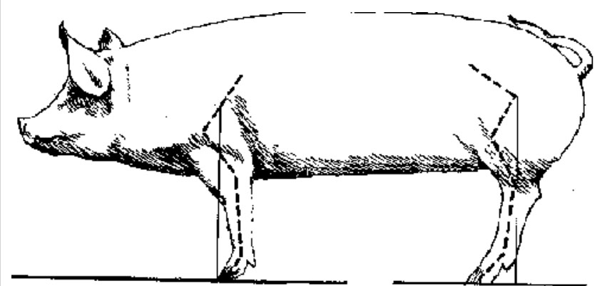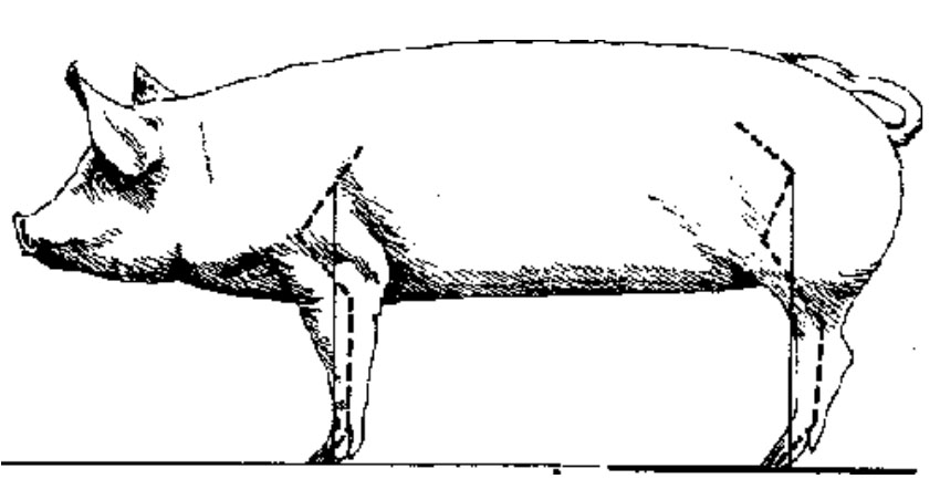 Hvis en gris undlader at støtte på en klov, kan det være tegn på en klovforandring. Er mere end én klov angrebet, er benstillingen understillet med både for- og baglemmer (figur 2 og 4). Derudover ligger dyret meget ned, hvilket kan give anledning til tryksår på skulder og haser.